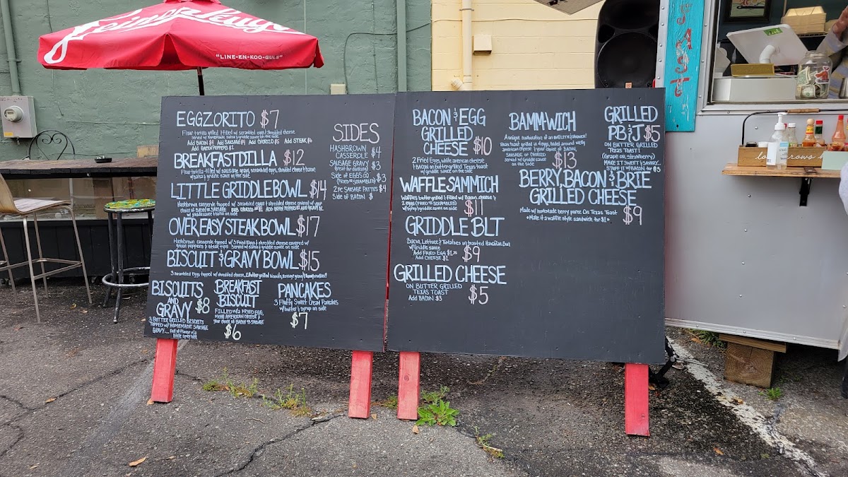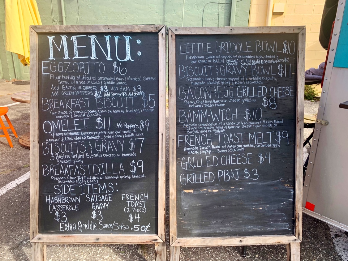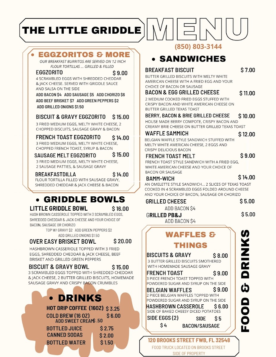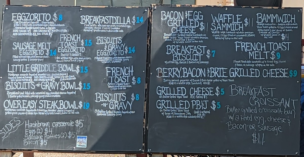 Flour tortilla grilled and filled with Sausage Gravy, 2 Chopped Biscuits, Crispy Bacon crumbles, 3 Fried Eggs and White American Cheese. Served with Salsa and Griddle Sauce on the side.