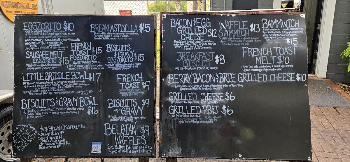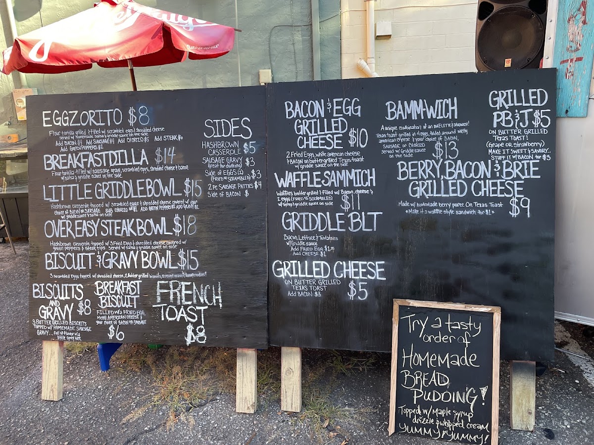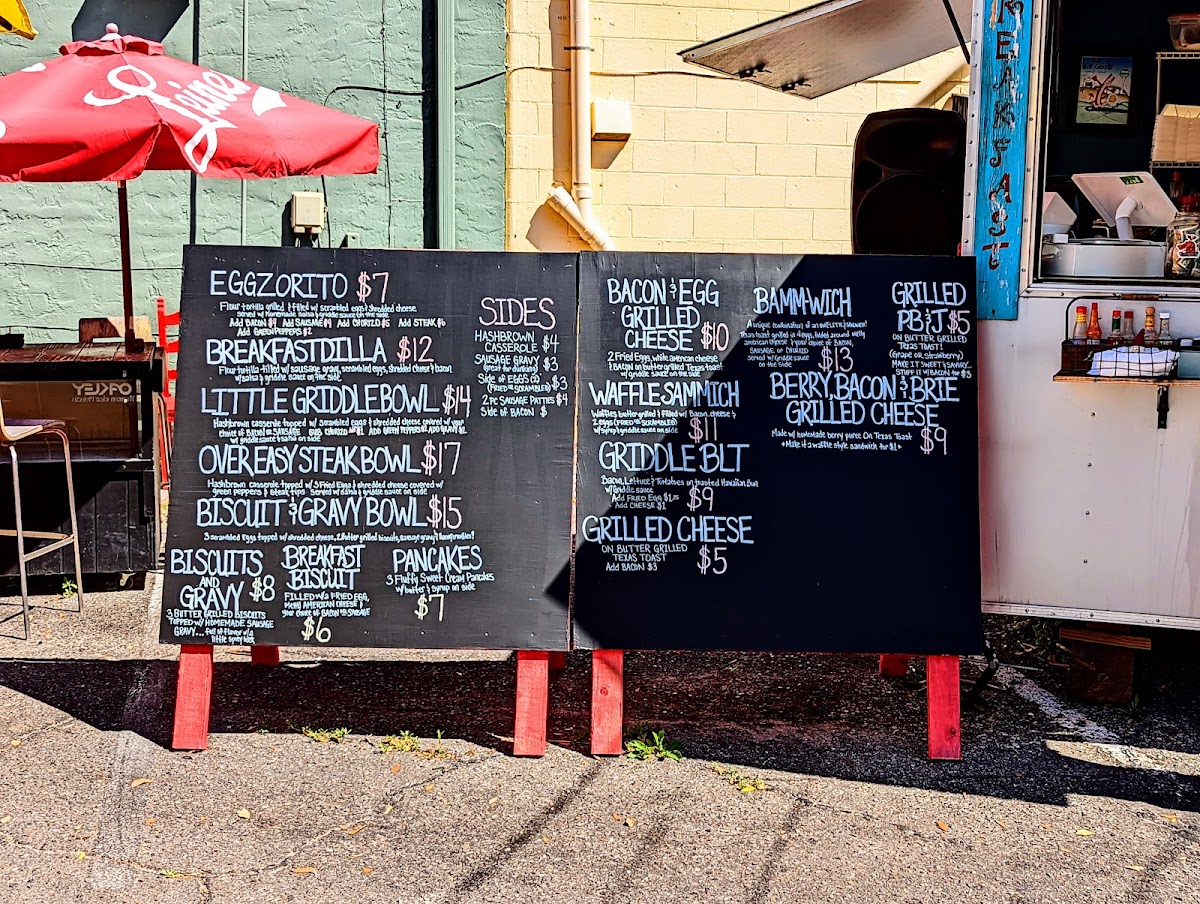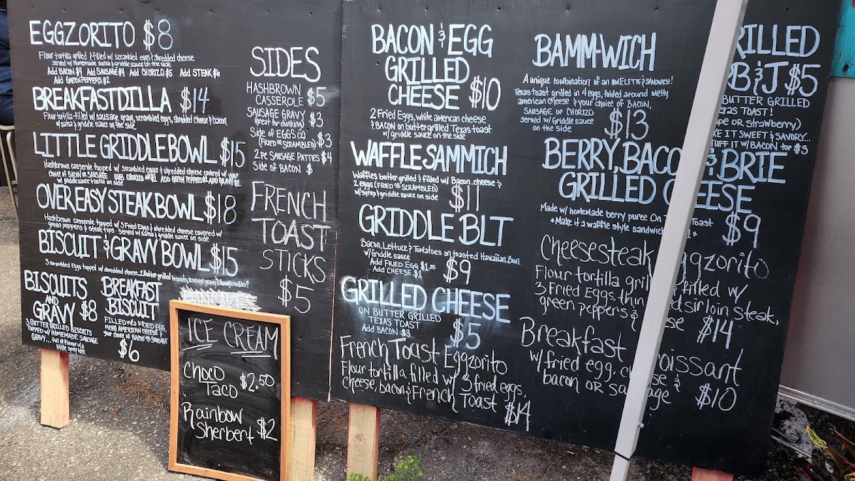 Flour tortilla grilled and filled with Sausage Gravy, 2 Chopped Biscuits, Crispy Bacon crumbles, 3 Fried Eggs and White American Cheese. Served with Salsa and Griddle Sauce on the side.